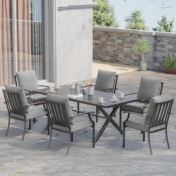 Halmuz 7-Piece Metal Patio Outdoor Dining Set with 6 Chairs, Large Table, Umbrella Hole and Gray Cushions