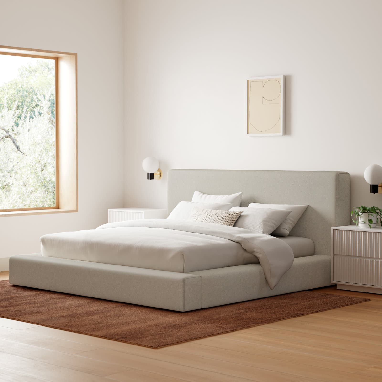 Clean-lined and inviting, this bed features a low profile that opens up your bedroom and gives it understated modern style. It has an engineered wood frame that's wrapped entirely in fabric, and it comes in a textured hue of your choice to suit your room's overall aesthetic. The rectangular headboard brings a minimalist vibe to your sleeping space, and it's padded with foam to cushion you as you prop up with your favorite reads. A series of slats eliminates the need for a box spring, so all that's left to get is a mattress (sold separately).