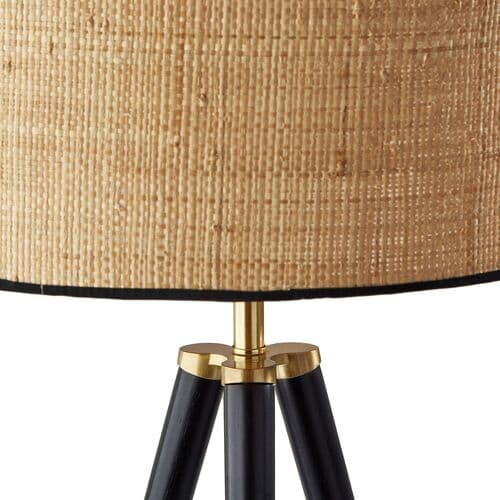 Integrating natural elements into a contemporary tripod style, this floor lamp complements any décor. It features a durable and stylish tripod base with distinctive details, available in walnut with antique brass, black wood, or natural wood with black accents. The lamp is crowned with a short rattan drum shade that softly diffuses light from a 150W bulb. Fabric trimming on the shade matches the base finishes. The 3-way rotary socket switch provides adjustable brightness, powered by a 5' fabric-covered cord. Enhance your interior with the matching table lamp.