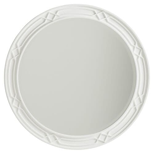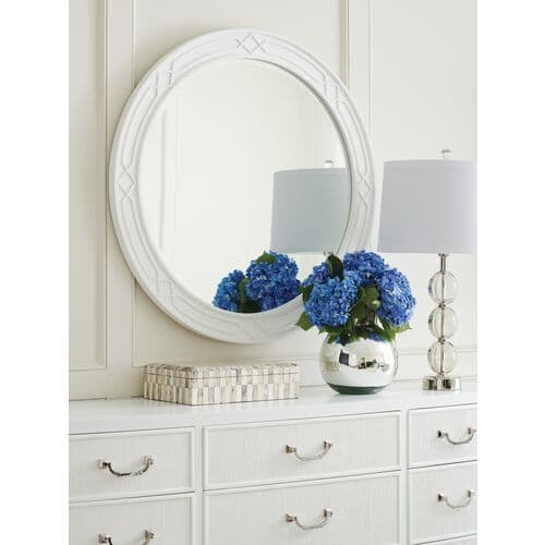 White frame features raised fretwork, alongside a beveled mirror, creating a classic look.