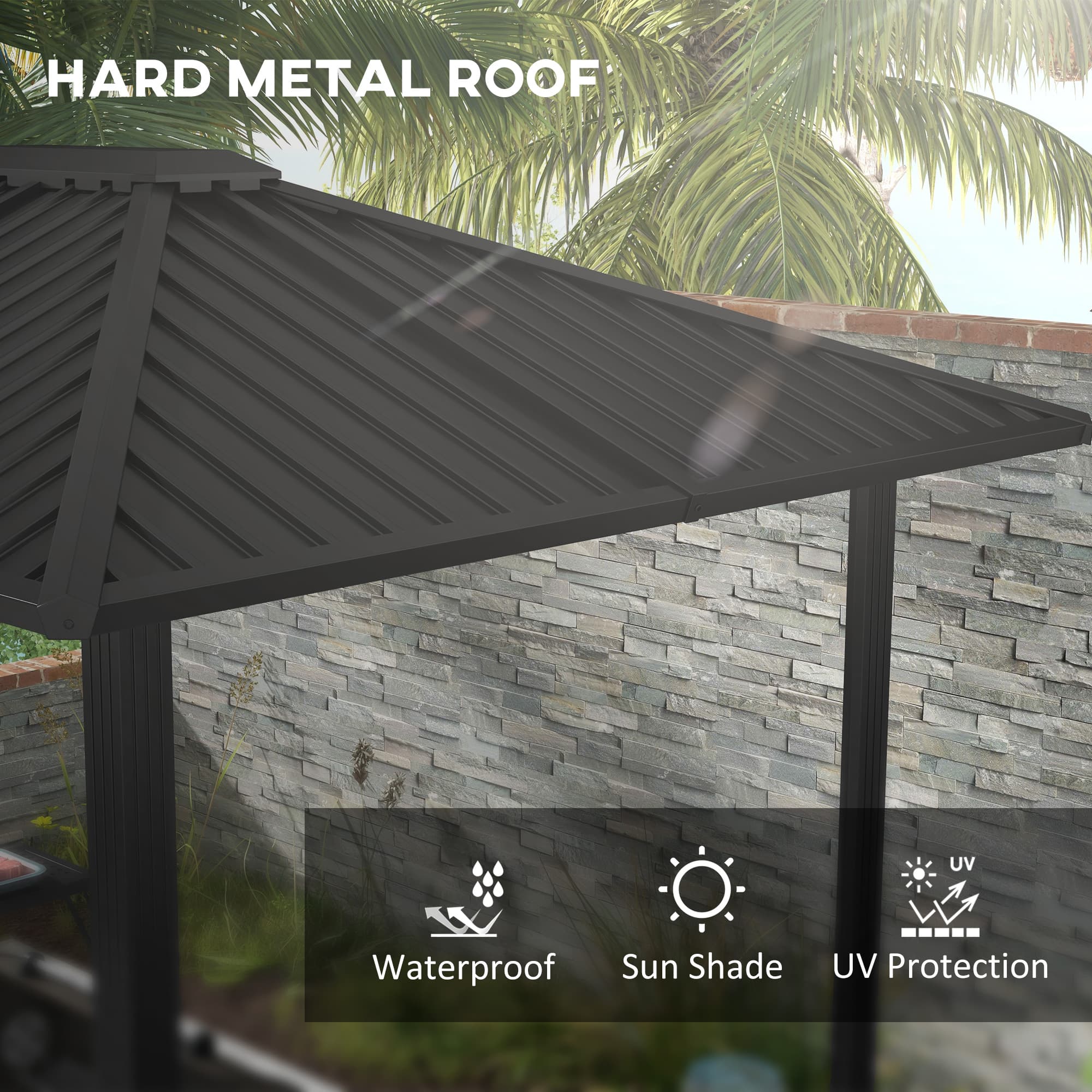 When barbecuing with friends or family, protect your gathering from rain or strong sun with this BBQ gazebo featuring a metal roof that resists UV rays and rain. Equipped with side shelves, it allows convenient storage for plates and tools. Enjoy your party and prepare food comfortably.