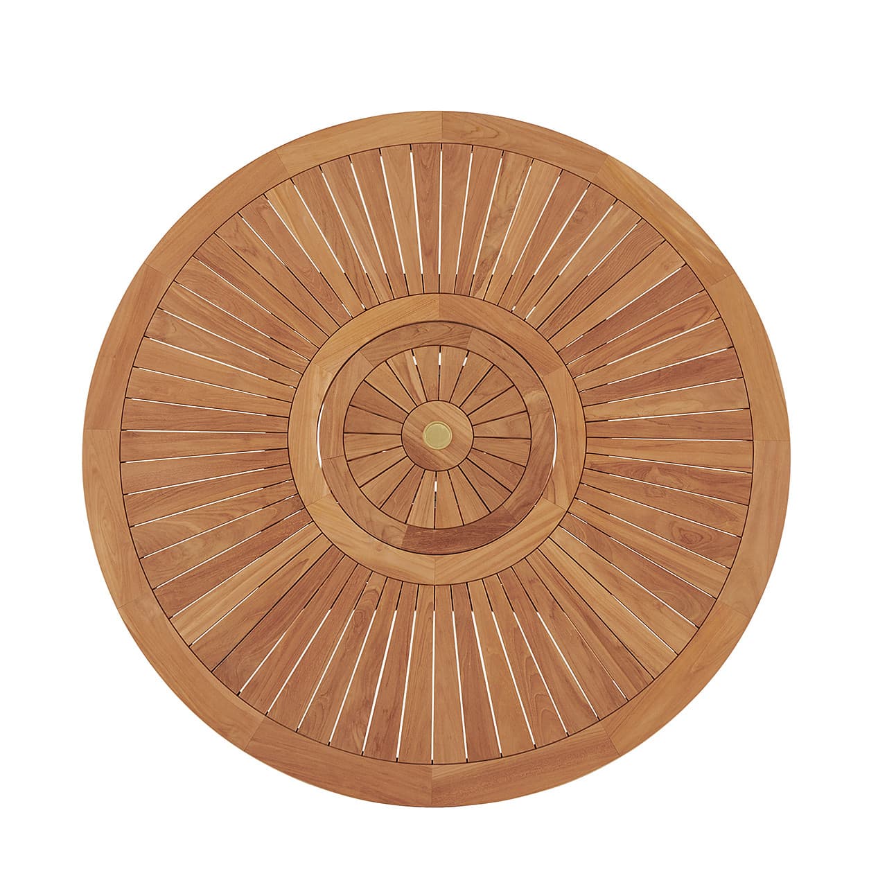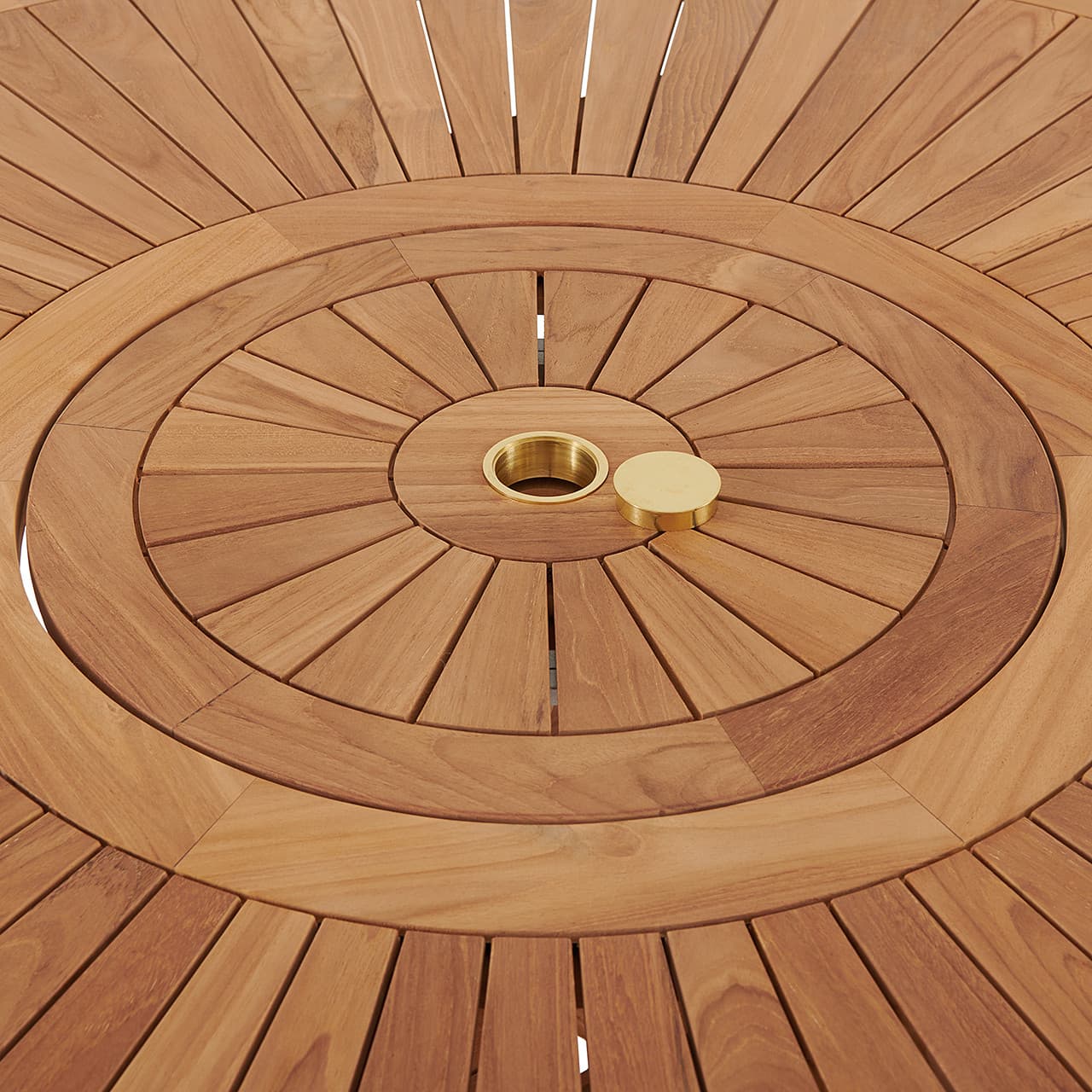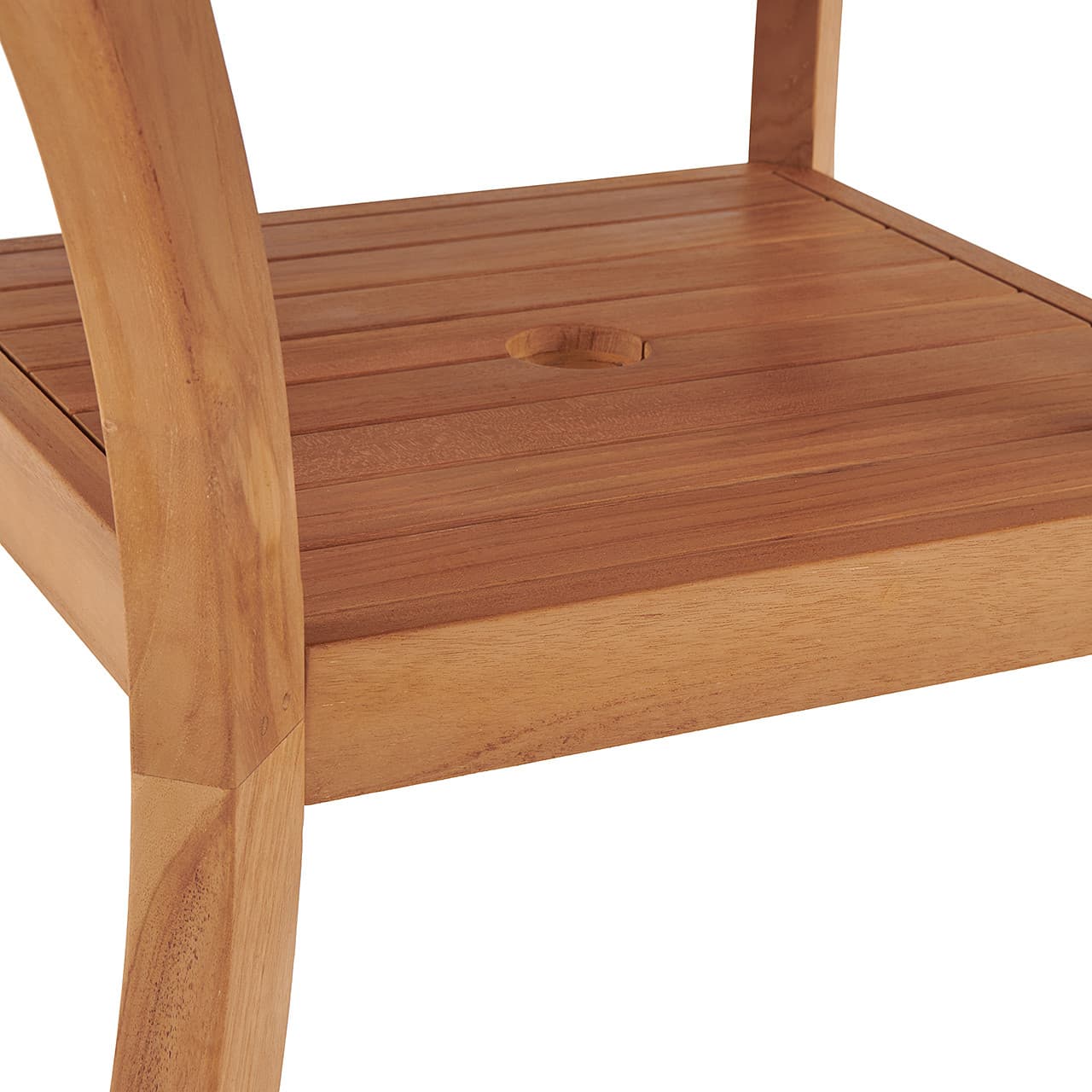 Transform your outdoor dining with the Eastchester set in a rich golden-brown hue. Constructed from solid plantation-grown teak, this set boasts durability against elements like water and mold. It features a fine, sanded finish and precise joinery. Providing comfortable seating for six, the dining table includes an umbrella hole compatible with standard umbrellas. With time, expect the teak to gracefully age to a silvery tone.