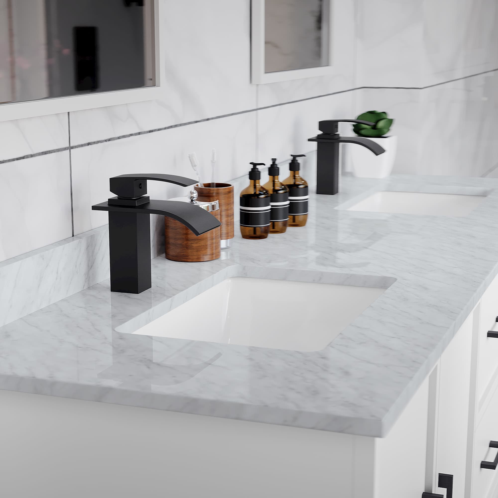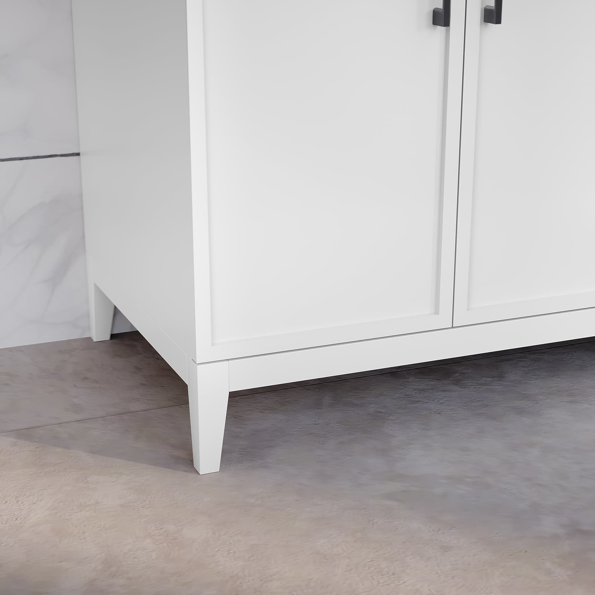 The Wyndham Collection offers a unique bath line, setting new standards in design and construction. This transitional vanity combines sleek sophistication with clean lines and a slim shaker design. Made with materials like solid wood and plywood, it offers various countertop options. Quartz and cultured stone counters come with a backsplash. Available in painted finishes or white oak veneer, it marries aesthetics with practicality. Soft-closing drawers and doors provide ample storage for essentials, maintaining a tidy space. Angular hardware contributes to a stylish bathroom focal point. Enhance your bathroom with beauty and function in mind. Available in multiple sizes and finishes, it features environment-friendly solid wood to prevent warping. The wood undergoes a 12-stage preparation process. Offers highly water-resistant low V.O.C. finish, transitional styling, and a unique floor design. Drawers are dovetail with full-extension slides, and door hinges are concealed for soft-close. The counter includes 3" backsplash and reversible side-splash. Backsplash comes in two pieces to avoid breakage risk. Available with Porcelain undermount sinks. Counter options include single or 3-hole faucet mounts. Faucets not included. Matching mirrors not included. Metal hardware finishes available in brushed nickel or matte black. Contains four functional doors and three drawers, offering extensive storage and counter space. Comes with a 2-year limited warranty and handling instructions. Warning about exposure to specific chemicals is included.