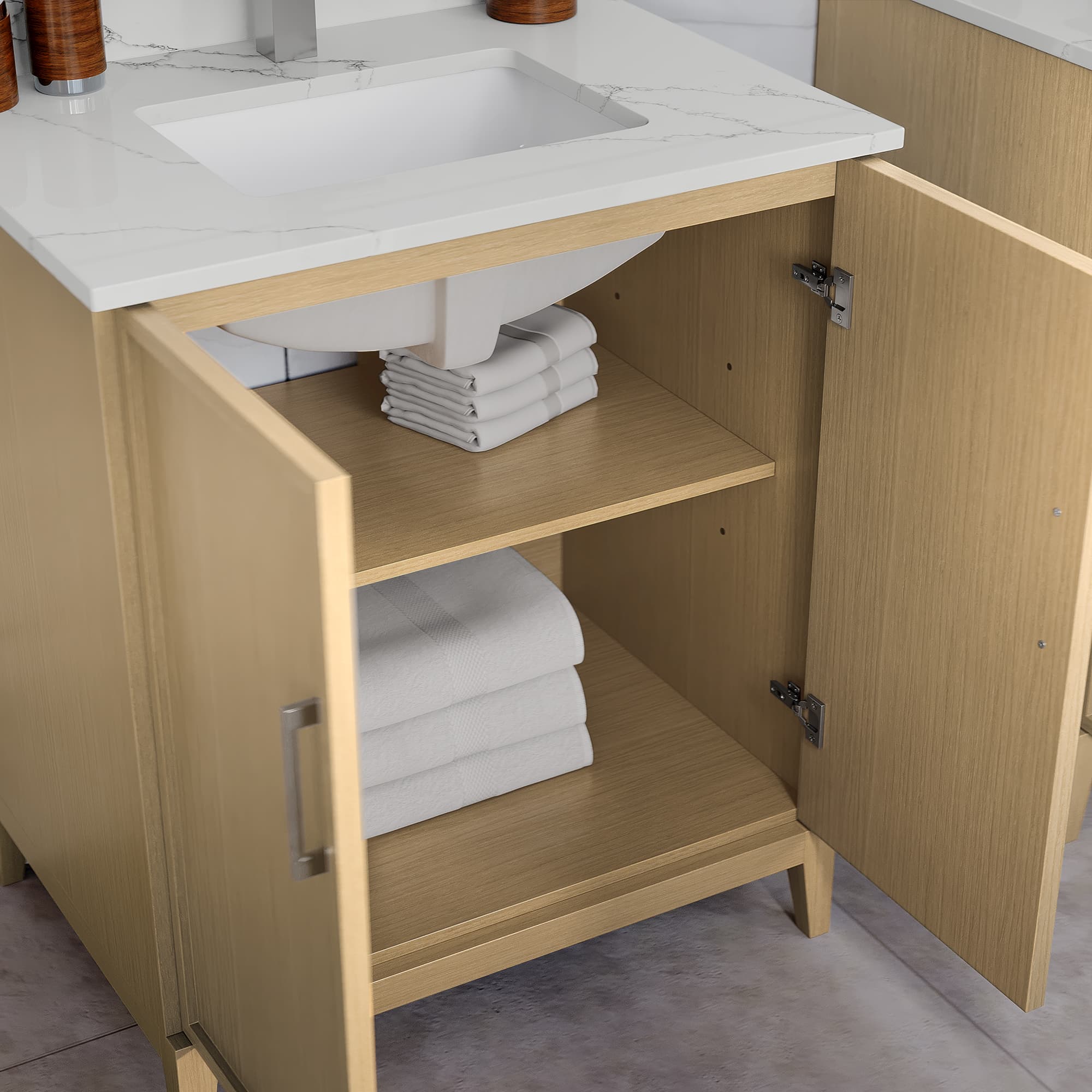 Wyndham Collection presents an innovative bath line with sleek transitional design. The Elan vanity, made from premium materials like solid wood and plywood, offers multiple counter options including quartz and cultured stone with included back-and side-splash. Finished in painted or rift-cut white oak veneer, it combines elegance with functionality. Integrated soft-closing drawers and doors provide ample storage for essentials, ensuring a tidy space. Its stylish hardware enhances the bathroom aesthetic. Available in various sizes and finishes, it includes environmental features and water-resistant finishes.
