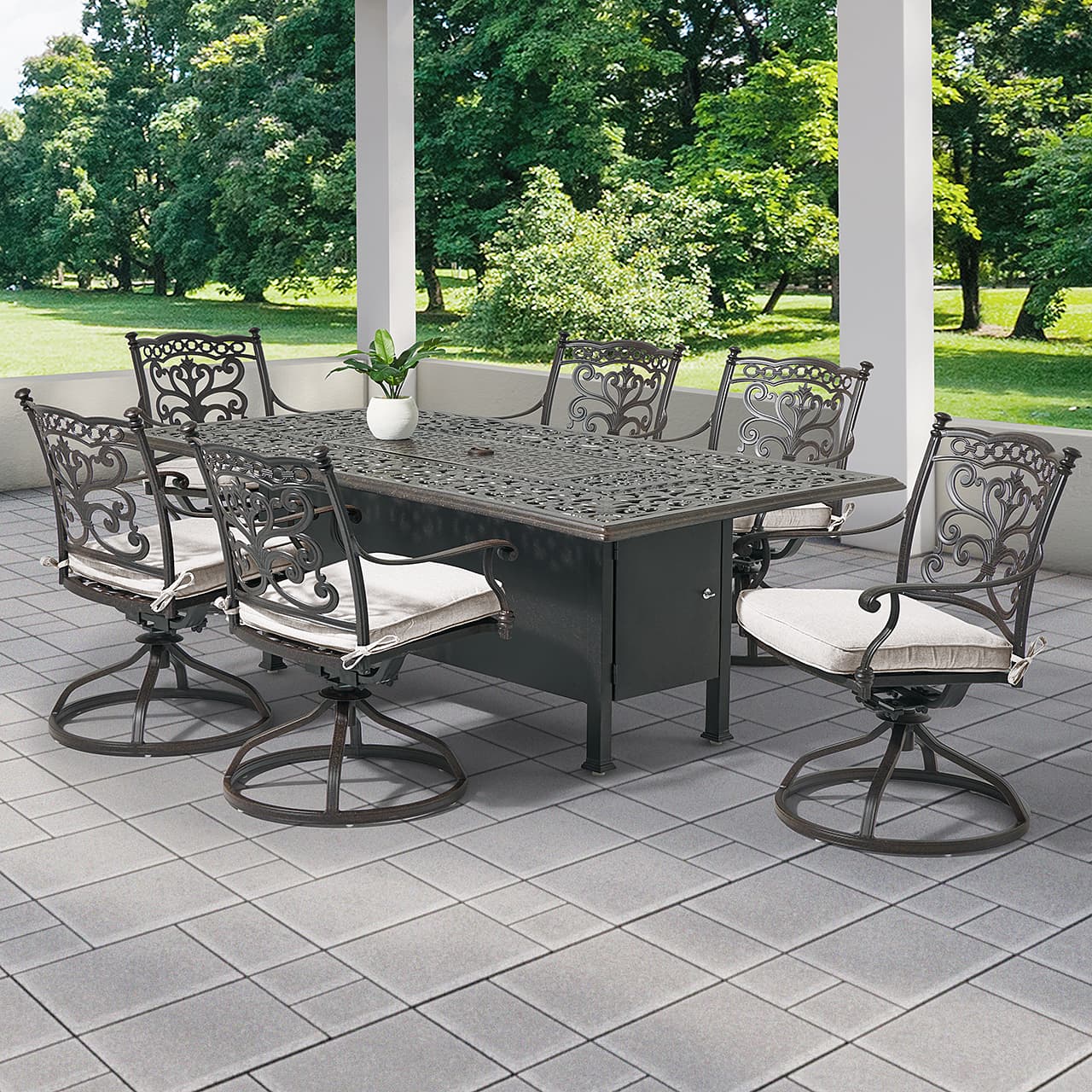 Milan Aged Bronze Cast Aluminum with Cushions 7 Piece Swivel Rocker Dining Set + 84 x 44 in. Fire Pit Table (Canvas Granite)