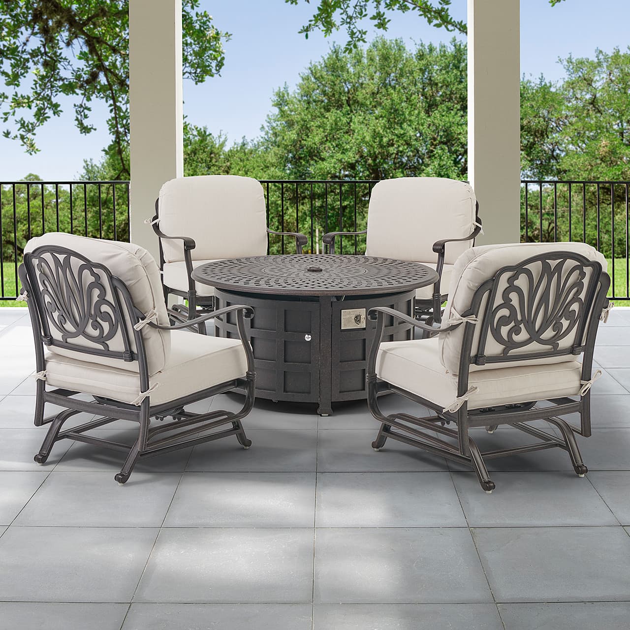 Cadiz Aged Bronze Cast Aluminum with Cushions 5 Piece Spring Chat Group + 48 in. D LP Gas Fire Pit Table (Beige)