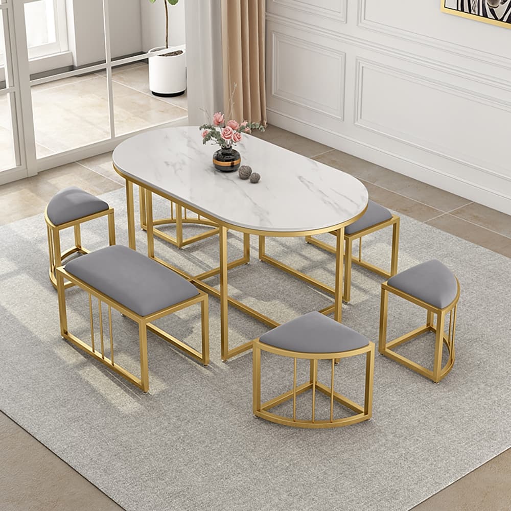 Enhance your dining room with this elegant dining table suitable for both fancy dinners and casual breakfasts. The sleek oval shape offers plenty of room for gatherings. The Sintered Stone top is smooth for easy cleaning and resists scratches, heat, and fading to maintain its beauty over time. With a top made from quality Sintered Stone and sturdy metal legs, this table with stools provides durability and elegance. * Finish: Gold * Color: White * Small Stool Dimensions: 15.7"L x 15.2"W x 15.2"H * Large Stool Dimensions: 26.6"L x 14.6"W x 17.7"H * Assembly Required: Yes * Care: Clean with a damp cloth, then wipe dry.