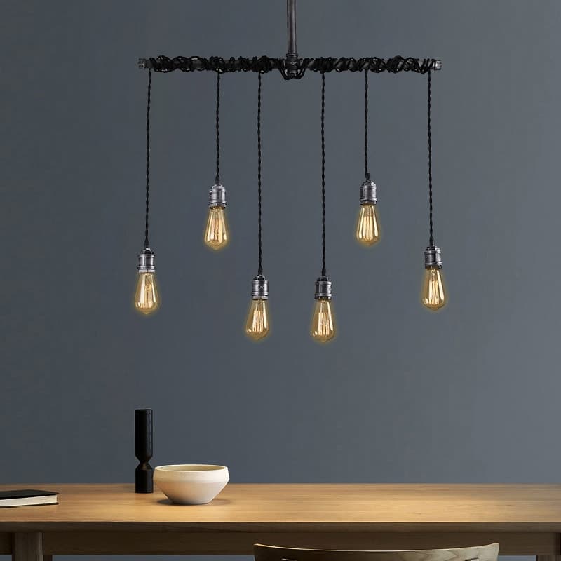 An industrial-style pendant light featuring six exposed vintage bulbs and black braided cords hanging from a plumbing pipe. It serves as an engaging feature both lit and unlit, offering an industrial aesthetic. Includes a round canopy and brushed black finish for a nostalgic warehouse appeal. Provides a warm, inviting glow suitable for areas like kitchen islands or dining tables. The cord can be adjusted to desired lengths. Constructed from metal with a brushed black finish. Requires hard wiring, and professional installation is recommended. Uses 6 x 40W incandescent E26 bulbs (not included).