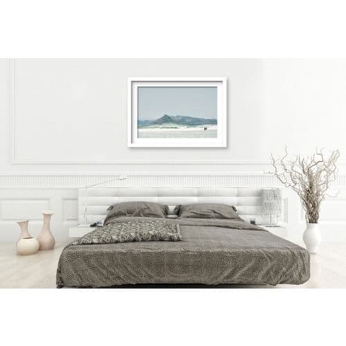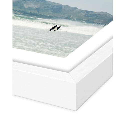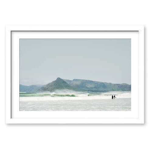 Christine Flynn's artwork captures surfers entering the sea in South Africa, with mountains in the background. The piece is printed on quality paper and framed in deep wood, ready for display. Based in Toronto, her work combines scenic landscapes and urban life, blending photography with graphic elements and textures. This mixed media piece showcases her unique perspective. Her collections, like North American Bison and Urban Journey, explore diverse themes. Christine's exhibitions span North America and international art fairs in cities like London and Paris.