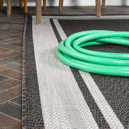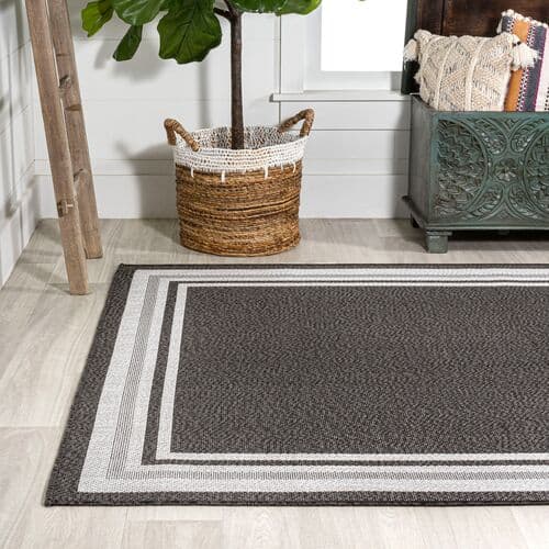 Featuring striking white-on-black borders, this polypropylene rug is perfect for defining spaces on a porch or patio and adds a bold touch to high-traffic indoor areas. It's advisable to use a rug pad to prevent slipping and extend its life.