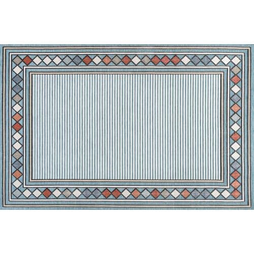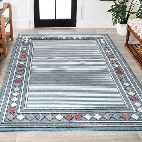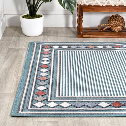 The rug features a high-low pile and a multicolor diamond border, adding a breezy touch to its striped design. Crafted from polypropylene, it is suitable for both outdoor and indoor use, and cleaning is easily done with a hose. Using a rug pad is suggested to prevent slipping and prolong the rug's lifespan.