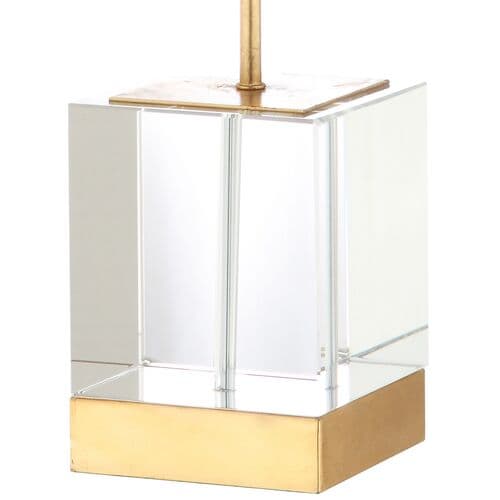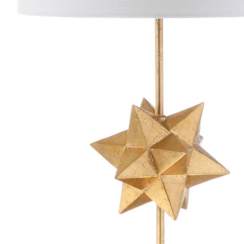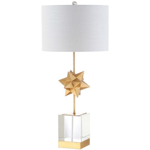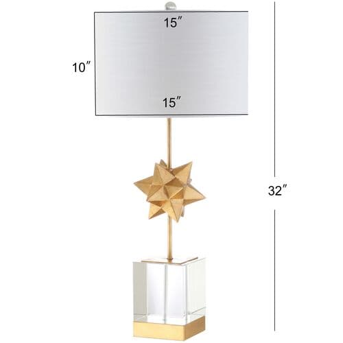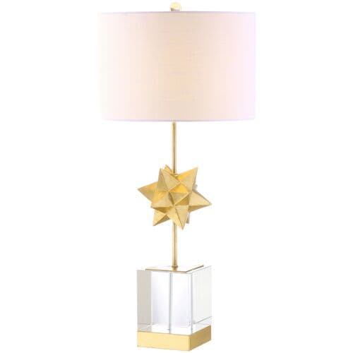 Boasting distinctive star power, this lamp features a gold starburst atop a crystal cube with a gold base. It includes a linen shade and a silk-wrapped cord, adding to its elegance.
