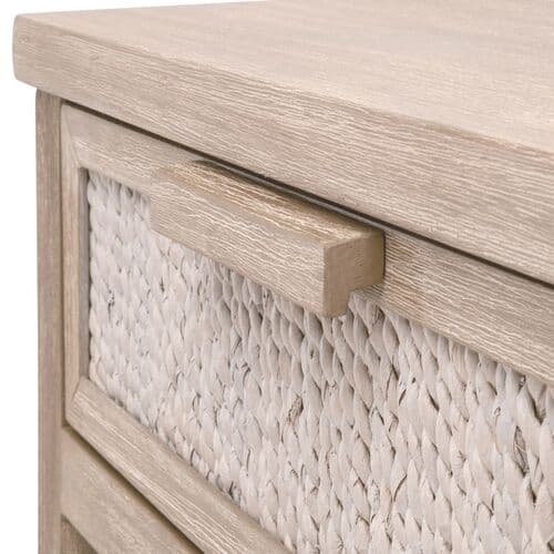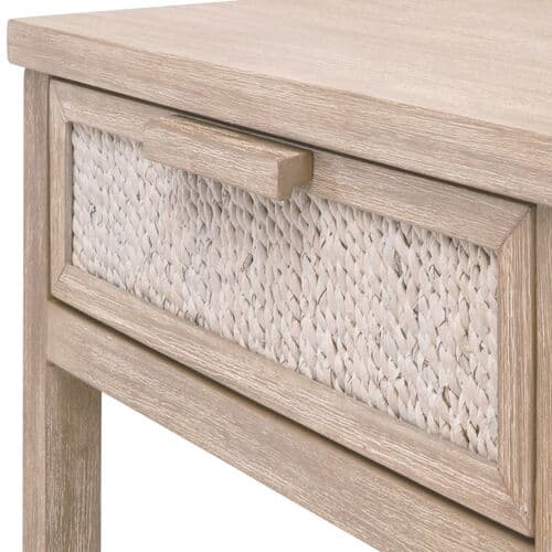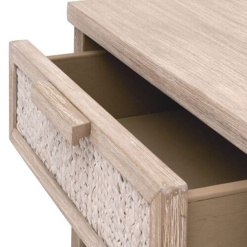 Featuring a transitional style, this nightstand combines white washed abaca rope with mahogany wood in a natural gray finish, offering a blend of texture and color. The handwoven abaca rope provides a unique tropical charm with an organic appearance. A single storage drawer keeps your essentials organized, while the lower shelf offers additional space for bedside necessities. With a finished backside and adjustable feet levelers, this nightstand is versatile and stylish. It measures 24 inches wide, 22 inches deep, and 26 inches high. Enhance your bedroom's look with this coastal-inspired piece.