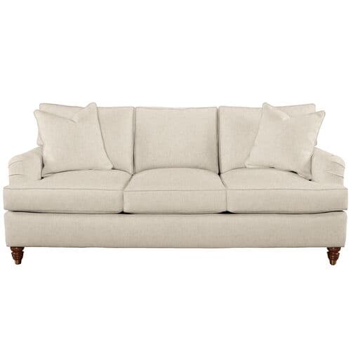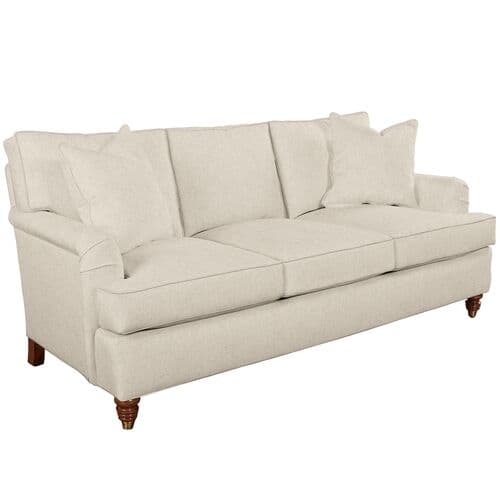 Exclusive to One Kings Lane, this English arm sofa combines timeless design with classic appeal, showcasing beautifully turned wood legs. Upholstered in Crypton, an eco-friendly and durable fabric, it protects against stains, spills, bacteria, and mold. Includes two throw pillows. Its engineered hardwood-laminate frame, eight-way hand-tied suspension, and spring foam cushion with down-proof ticking offer enduring comfort and support. Crafted by artisans in High Point, NC, the sofa features a lifetime warranty on the frame and suspension, and a limited lifetime warranty on the cushion.