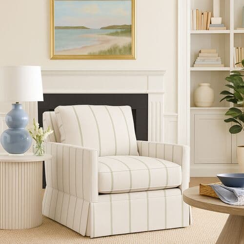 Available exclusively at One Kings Lane, this club chair offers a neat and tailored appearance with its classic skirt design. The upholstery, a blend of polyester and cotton, showcases a wide stripe that remains timeless. It's built with a frame of engineered hardwood-laminate and features an eight-way hand-tied suspension system. The spring foam cushion, designed with down-proof ticking, ensures comfort and durability. Handcrafted by artisans in High Point, NC, it comes with a lifetime frame and suspension warranty, and a limited lifetime warranty on the seat cushion.