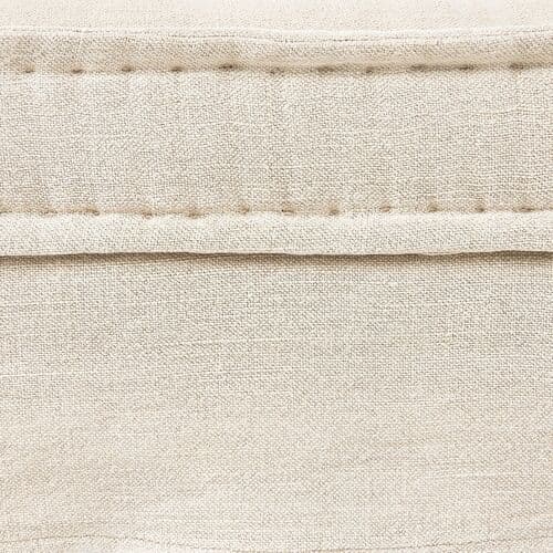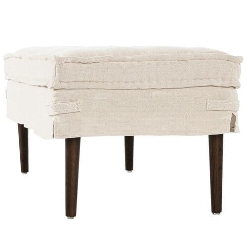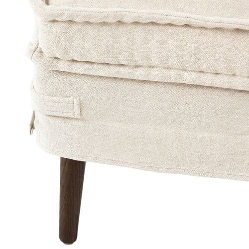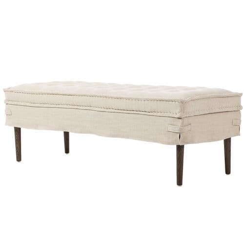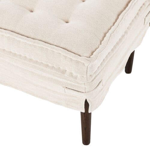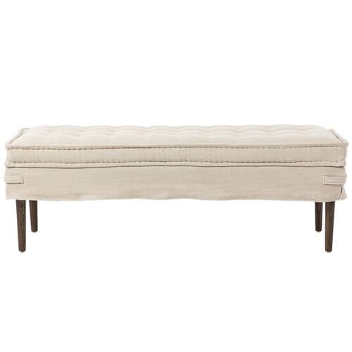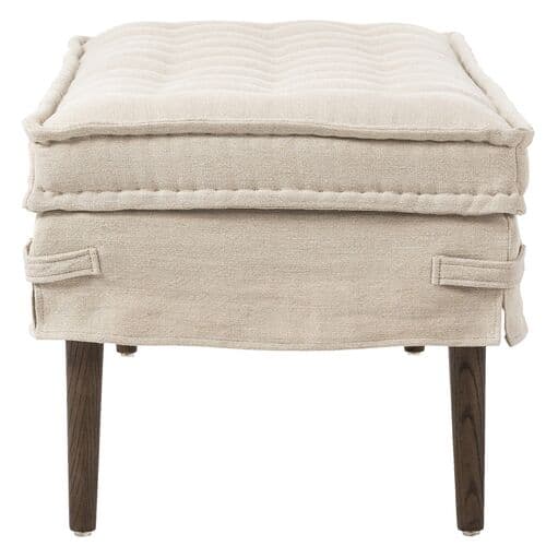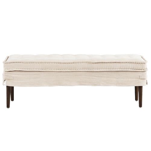 Featuring a nod to traditional craftsmanship, this bench includes a French mattress-style cushion with hand-stitched X patterns and blind tufts. Tapered dark brown oak legs provide support, while the bench is finished with a tailored slipcover, kick pleat, and corner straps, all in a natural, linen-like fabric.