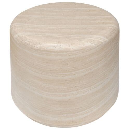 Focus on materials. This outdoor end table is designed in a classic drum shape with a small plinth base. It should be covered or stored indoors during bad weather or when not in use.