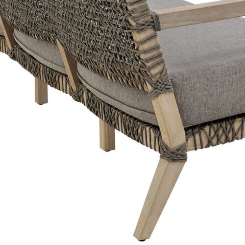 Designed with both style and durability in mind, this outdoor sofa features a frame made from teak, a hardwood known for its moisture and termite resistance. A special finish accelerates its development into a distinctive silvery hue. All-weather rope intricately weaves the back and seat support, while the removable cushions are covered in a weather-resistant fabric.