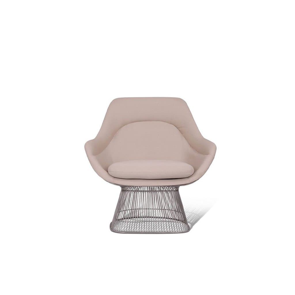 The lounge chair draws inspiration from the 1966 Platner Collection, embodying the Modernist era style. Featuring a blend of elegance and whimsy, its stainless steel wire base resembles a shiny sheaf of wheat. The design p.