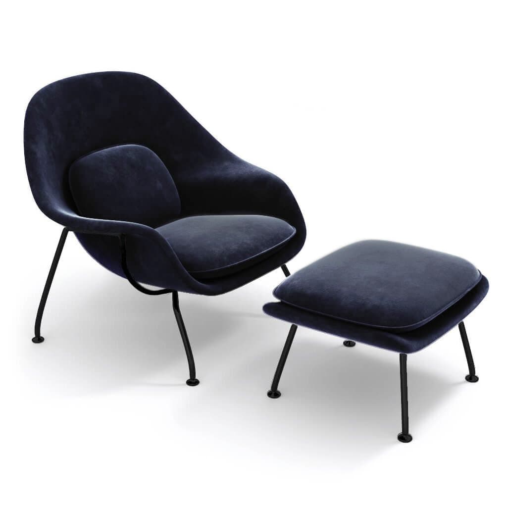 Womb Chair & Ottoman - Black Powder-Coated Steel Legs Lustrous Velvet-Royal Blue