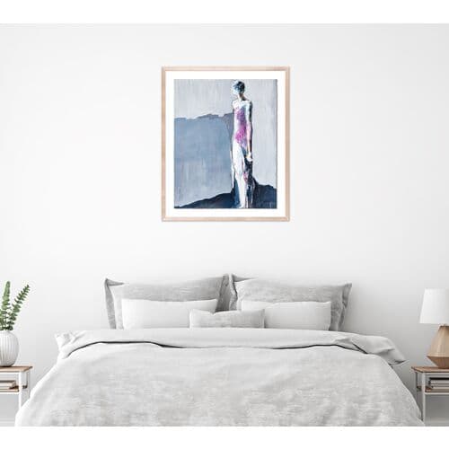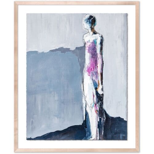 This piece is a precise giclée reproduction of a painting by artist Jane Feil, presented floating above a white mat within a wood frame, ready to hang. Jane Feil, born in Chicago, earned her BFA from the California College of the Arts in 1976. Her artwork, focusing on the human figure, has captivated audiences as she raised six children and called Santa Monica home for nearly 30 years.