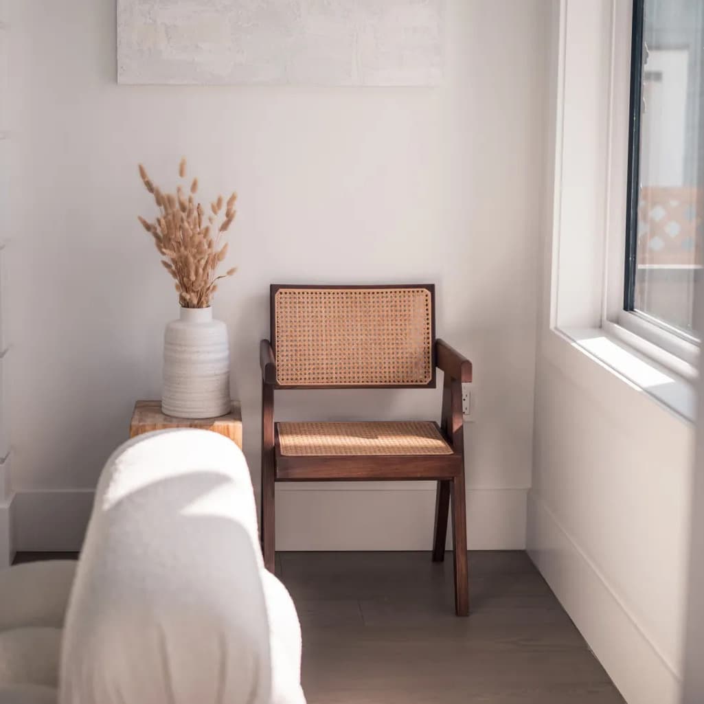 The Pierre Jeanneret Floating Back Armchair is a key piece in mid-century modern design from Chandigarh. Made entirely from solid wood, this chair features a woven backrest and seat stretched over a sturdy wooden frame.