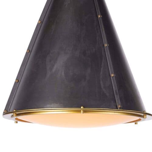 Brass studs line the sides of the conical shade, adding an industrial chic touch and a hint of glam. A diffuser beneath the shade provides a warm and flattering glow.