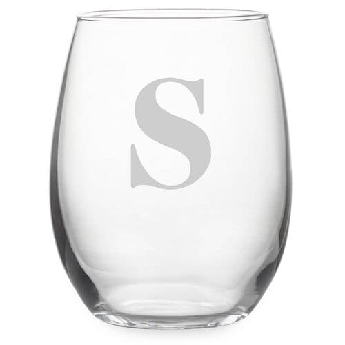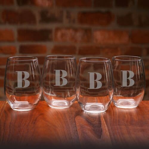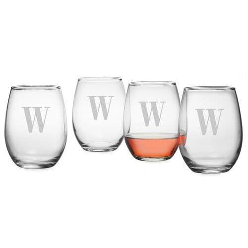 Crafted in the USA, this set includes four stemless wineglasses featuring a hand sand-etched monogram. These glasses suit a variety of occasions and are conveniently dishwasher safe.
