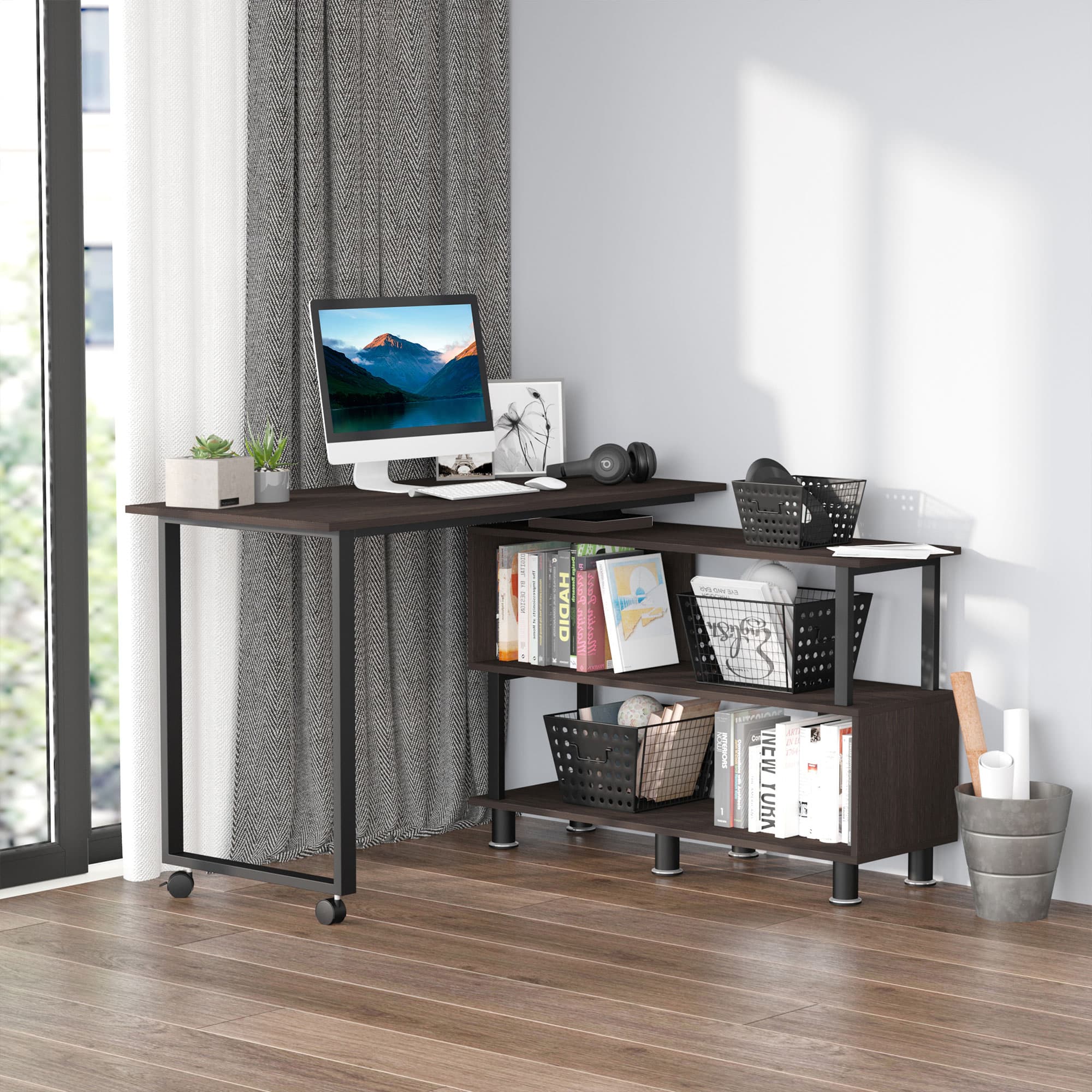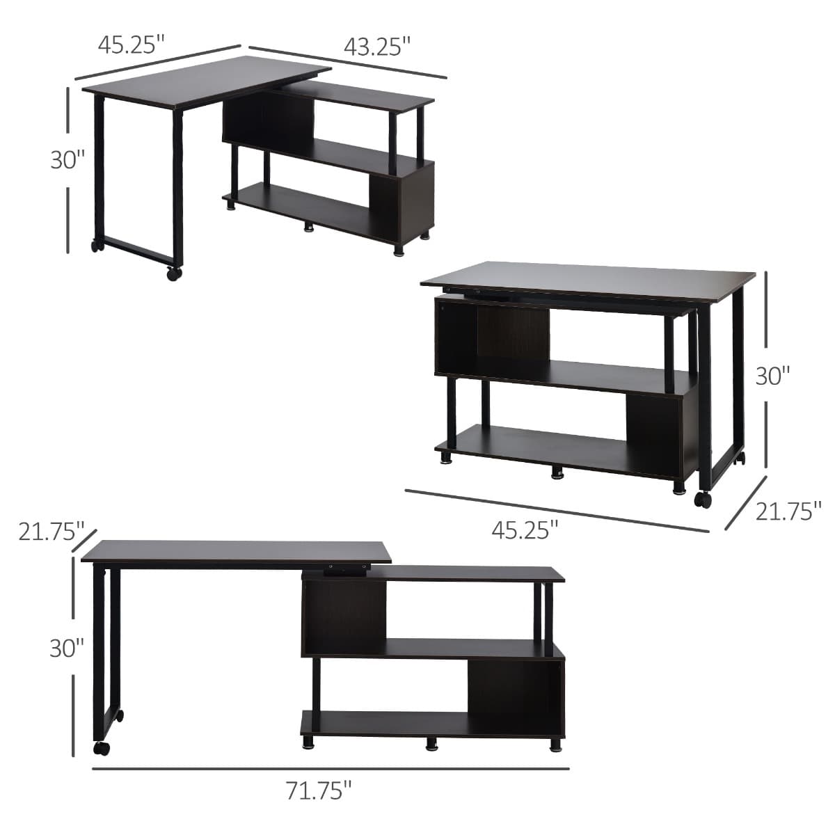 Corner table with storage, including two bookshelves, from HOMCOM has a 360-degree rotating design adjustable as a bookshelf, workstation, or a combination. The minimalist design adds character to your office or home for a modern office desk, bookshelf, or display case. The L-shaped and I-shaped configuration makes it a functional and stylish piece of furniture.