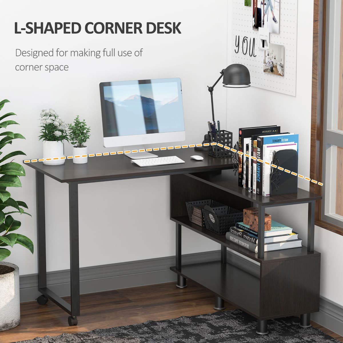 HOMCOM Mobile L-Shaped Rotating Computer Desk with Storage Shelves Moveable Rolling Writing Table Home Office Study Workstation, Coffee