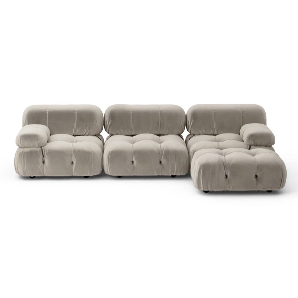 Bellinisofa's sectional pieces can be positioned independently. Rings and carabiners on the backs and armrests enable the user to configure an ideal 'seating landscape'. The design offers high comfort due to its structural details.