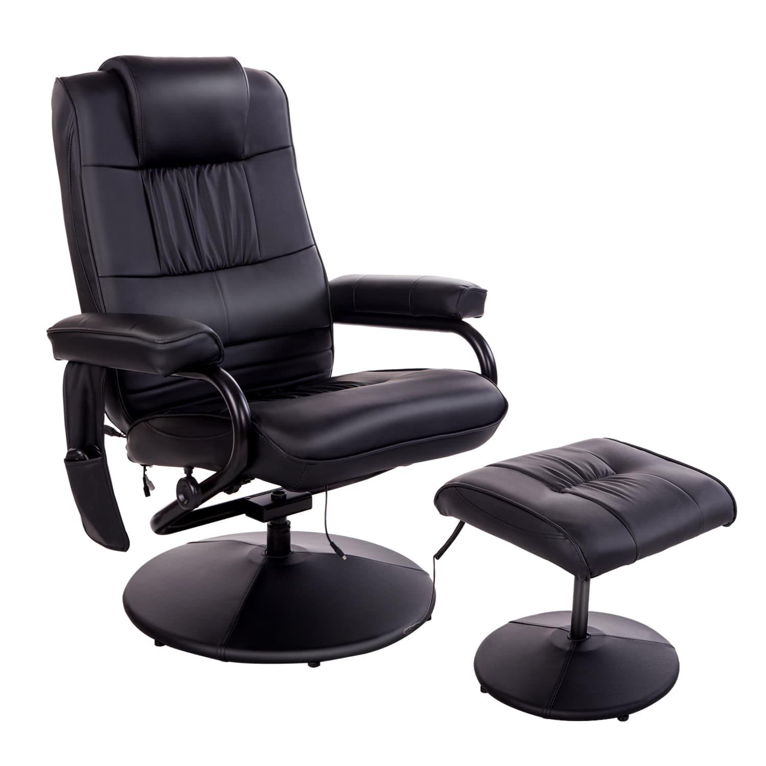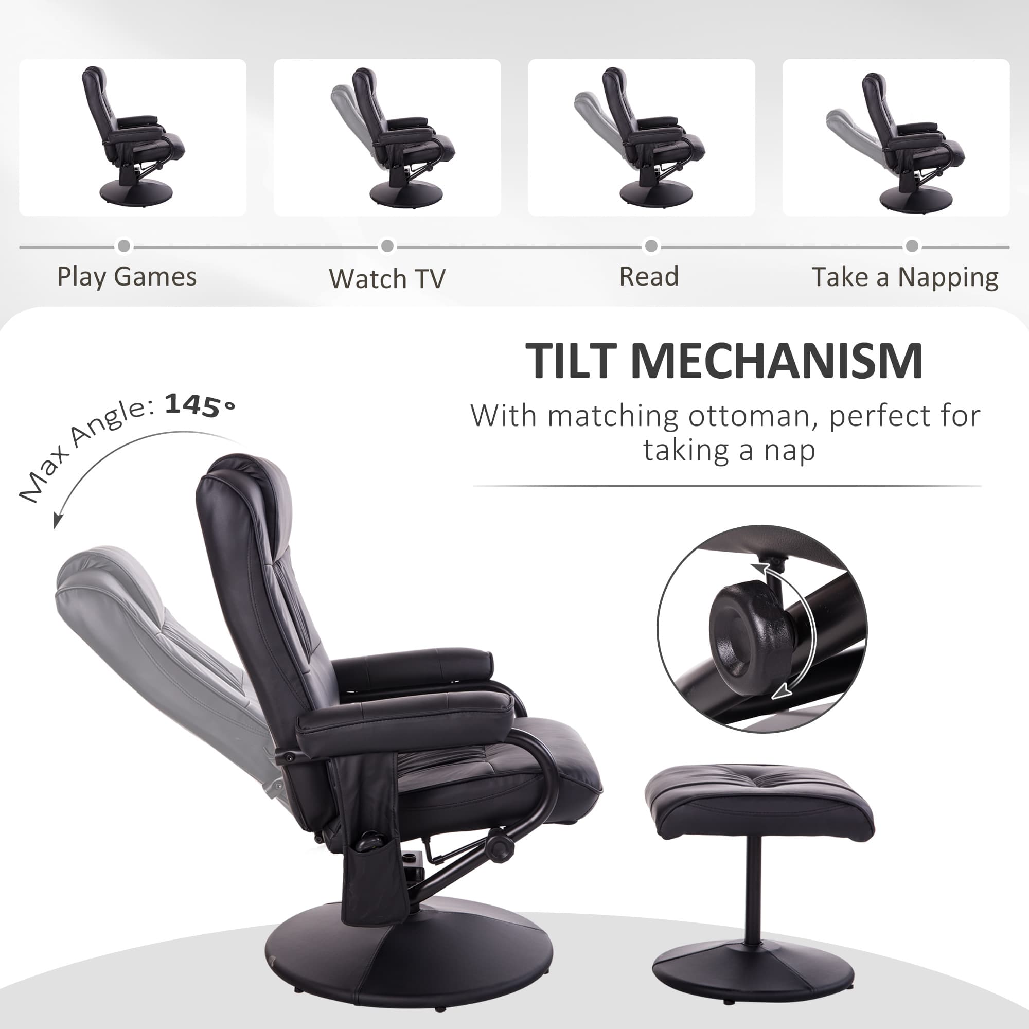 HOMCOM Recliner Chair, Massage Recliner Chair with Ottoman Footrest, Wooden Swivel Base, Leather Recliner Chair for Living Room and Bedroom, Black