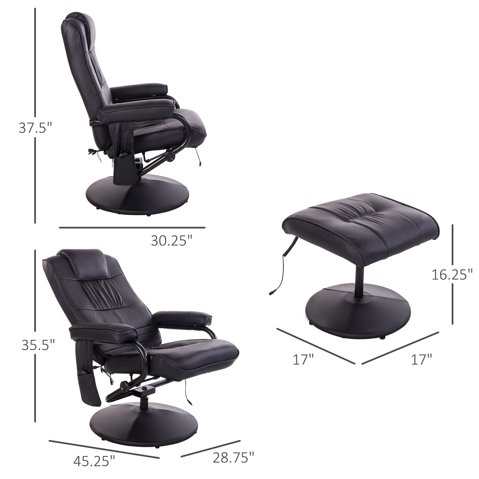 Unwind after a long day with comfort in this HOMCOM massage recliner chair. It offers massage points across the back, lumbar, thighs, and calves. Choose automatic mode for pre-set massages or manual mode to tailor your experience. The recliner allows you to adjust the backrest angle up to 145 degrees to fit your preference.