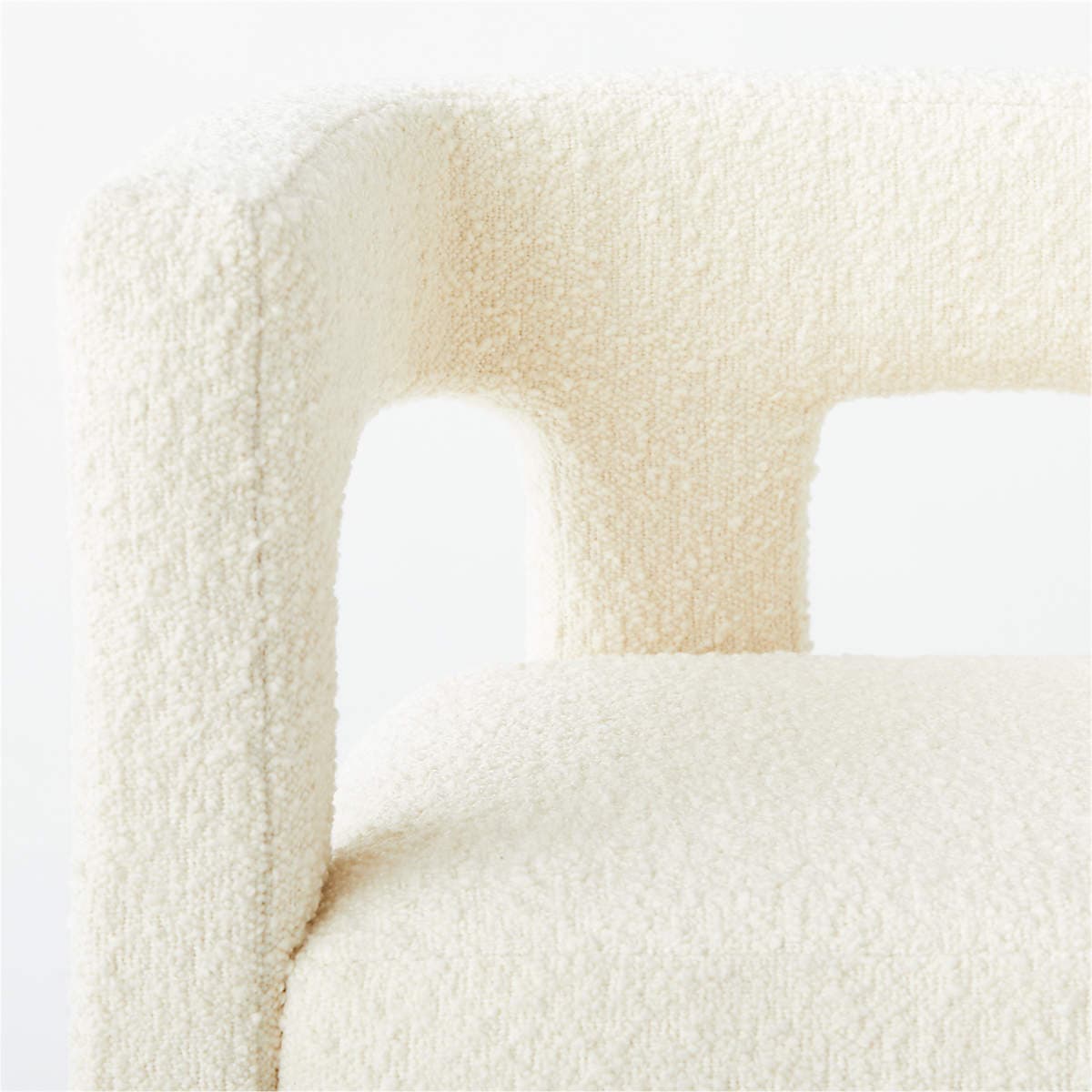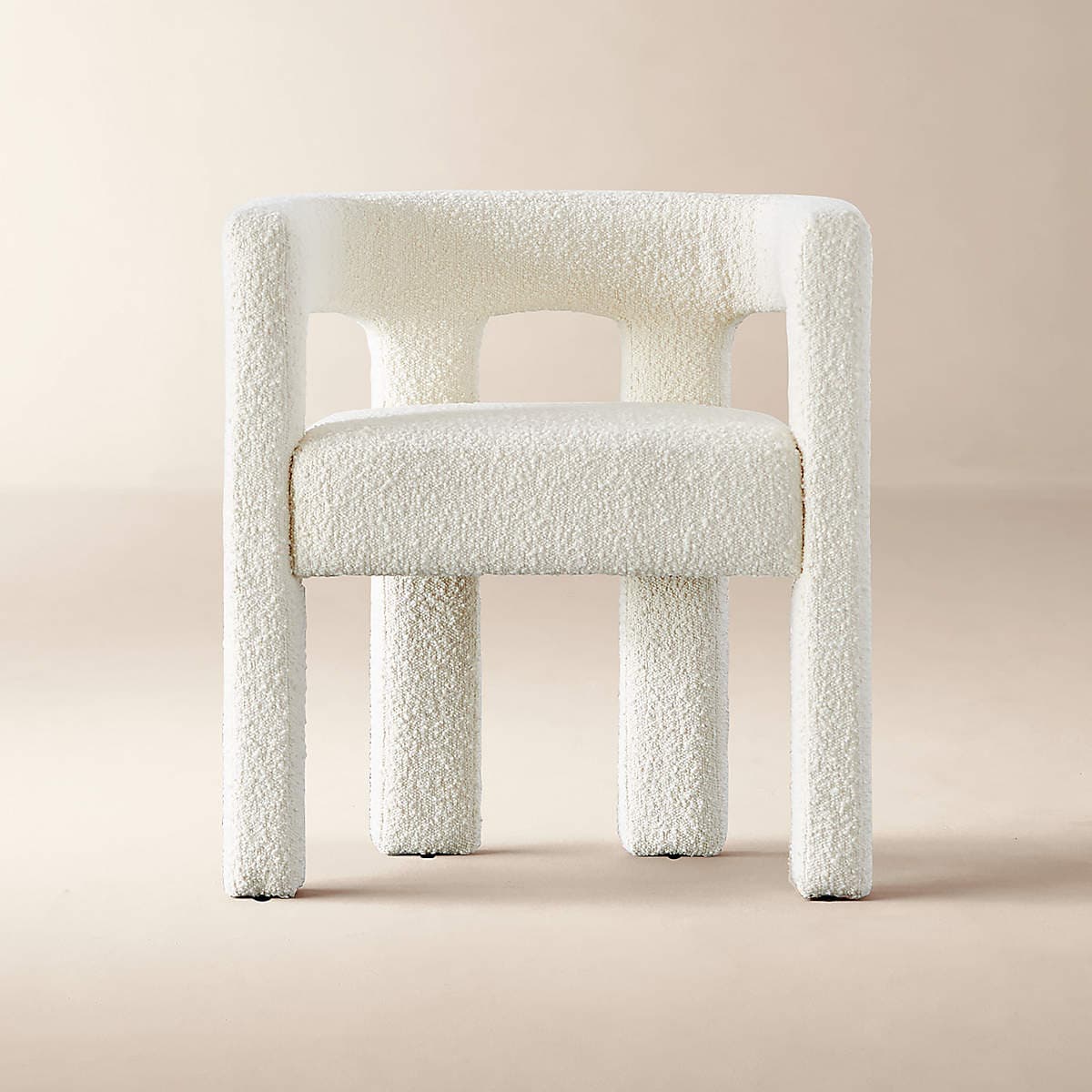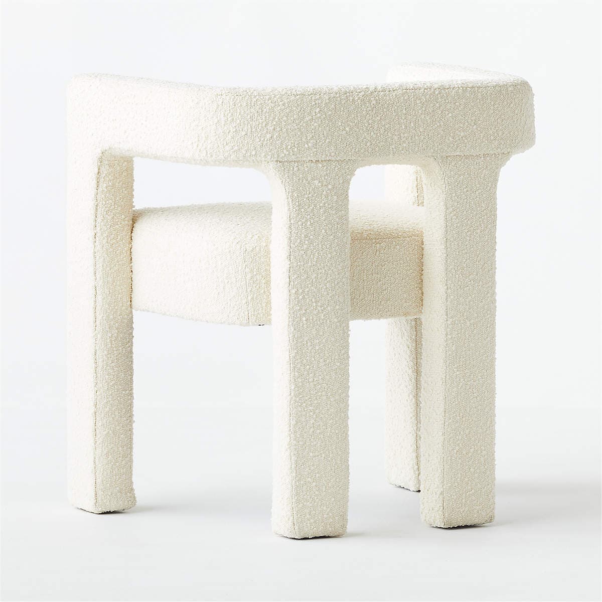 Available for purchase, the Stature Ivory Dining Armchair Set of 4 offers comfortable seating with its ivory boucle fabric. These chairs have an architectural profile and are plush for added comfort, with deep seats featuring rounded backs. Perfect for extended gatherings, they are exclusive to CB2.