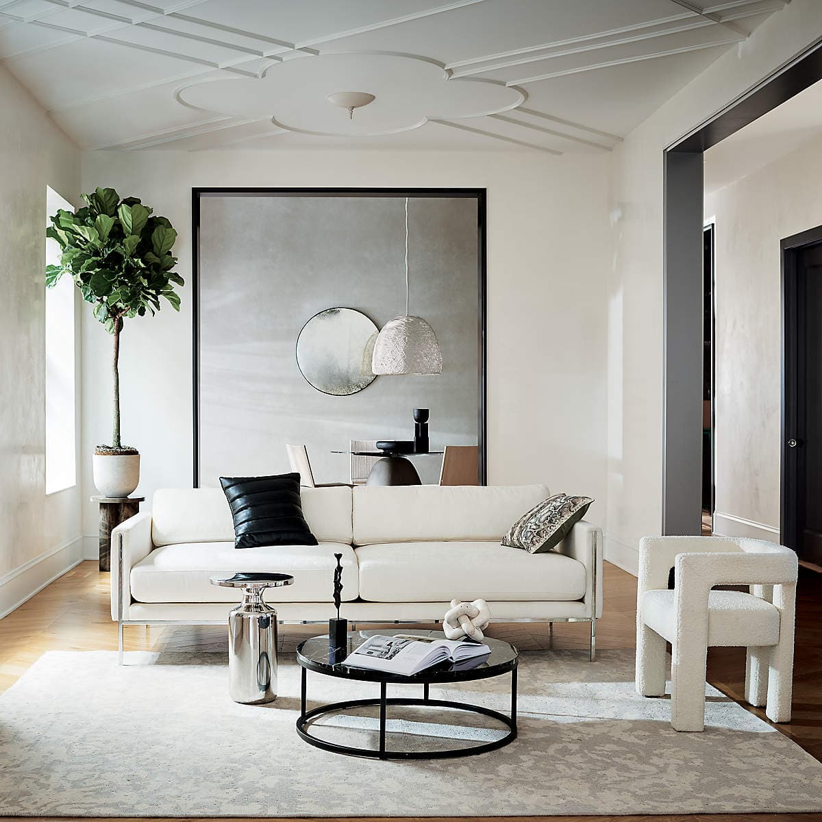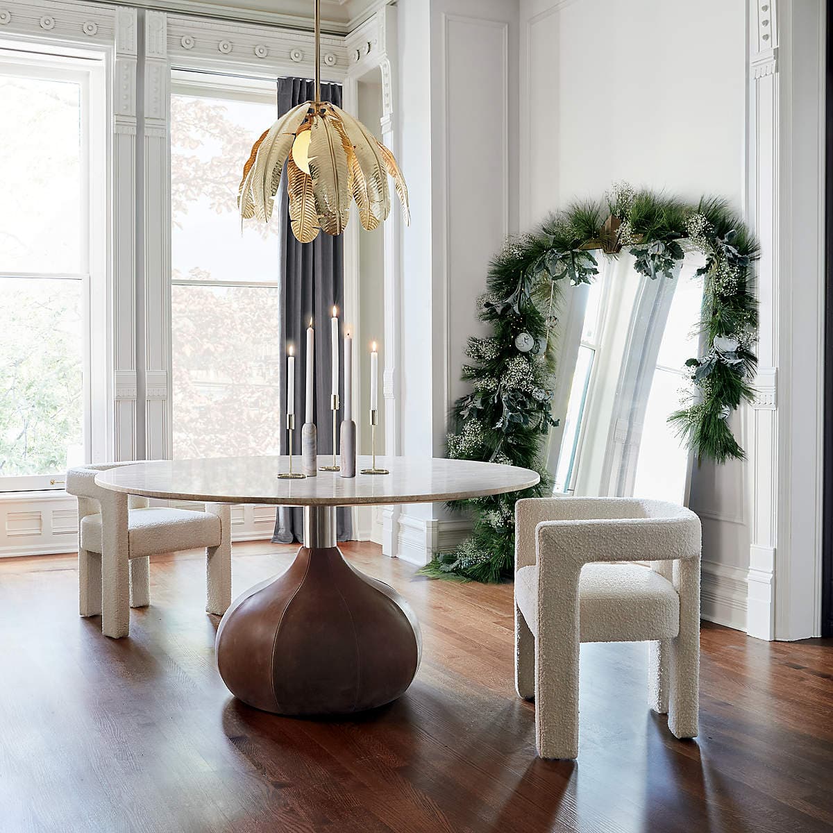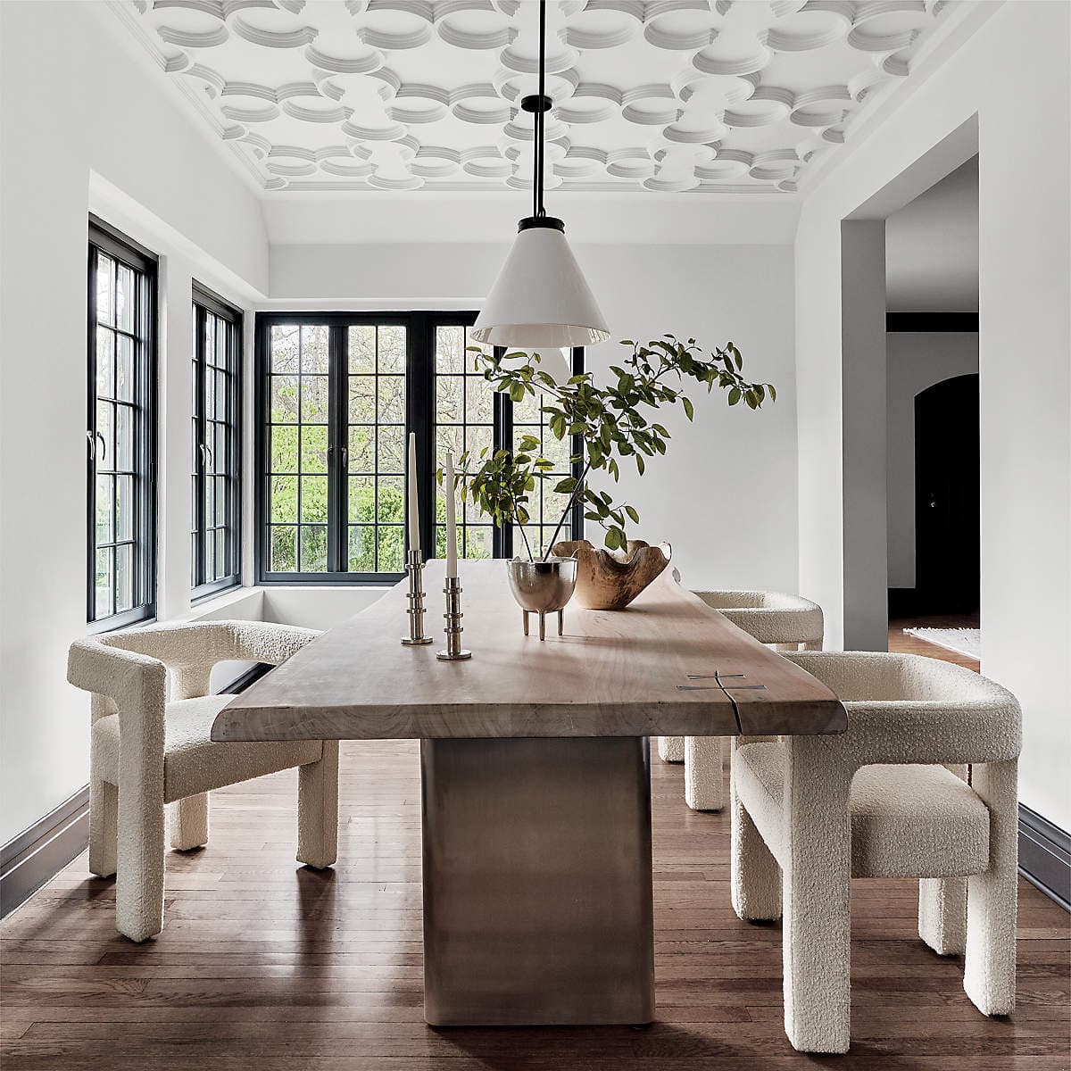 Available for purchase, the Stature Ivory Dining Armchair Set of 4 offers comfortable seating with its ivory boucle fabric. These chairs have an architectural profile and are plush for added comfort, with deep seats featuring rounded backs. Perfect for extended gatherings, they are exclusive to CB2.