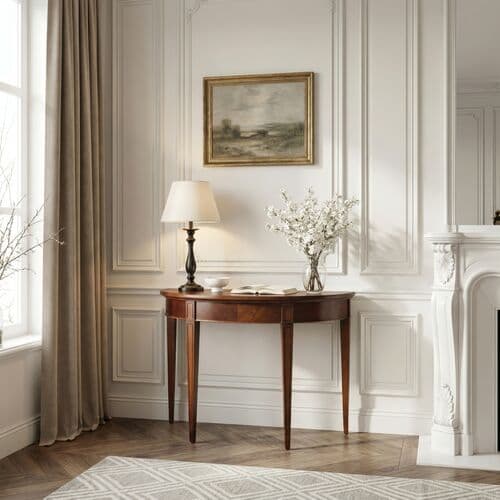 This console showcases cherry veneers with a warm finish, highlighting the wood's grain beauty. Its demilune silhouette and four ballerina-style legs make it ideal for positioning flush against a wall in an entryway or living area.