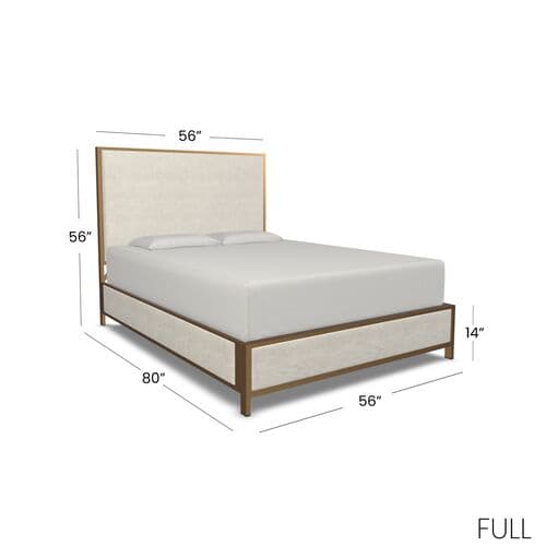 A clean-lined iron frame defines this panel bed, accentuated by a hand-applied gold finish that adds subtle shine. The design includes padded upholstery for comfort when reading or watching TV. Requires a mattress and box spring. Made in the USA.