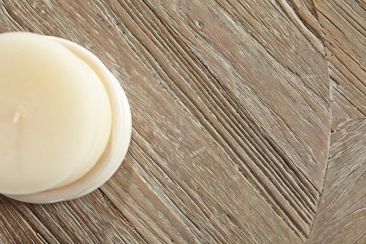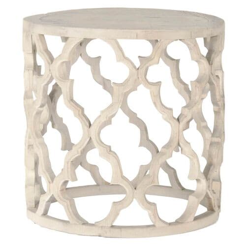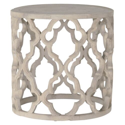 Masterfully crafted from recycled elm, this side table showcases exquisite quatrefoil fretwork and a richly textured grain accentuated by a distressed gray finish, making it a stylish addition.