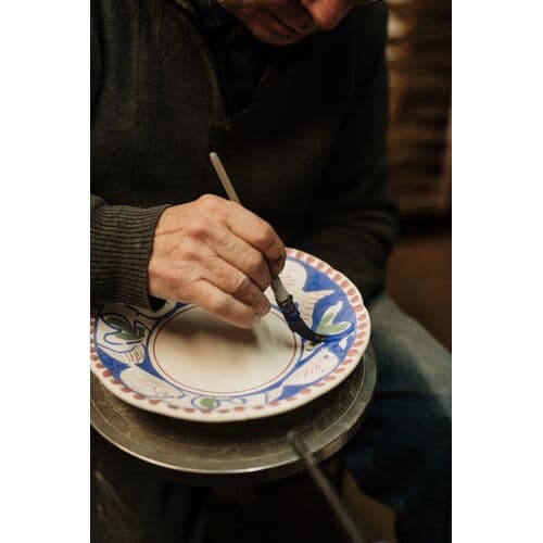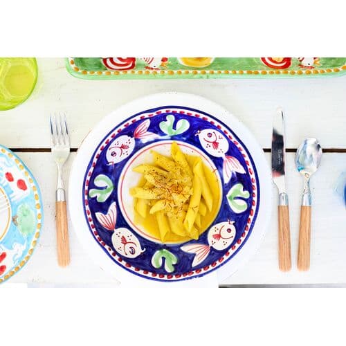 This dinner plate, handcrafted in Italy, is made of terracotta and adorned with a fish-and-algae design painted in bright colors.