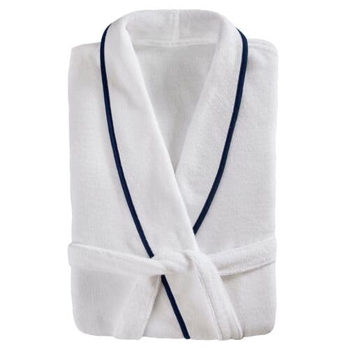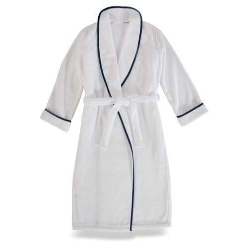 Crafted from soft, absorbent zero-twist cotton, this bathrobe features a shawl collar, cuffed sleeves, and stylish navy piping, making it perfect for drying off after a bath or lounging at home. Made in Turkey.