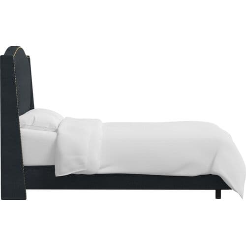 Brass nailhead trim on the headboard enhances the classic style of this wingback bed. Crafted in the USA, it offers ample cushioning, ensuring comfortable support for reading or watching TV. A mattress and box spring are needed.