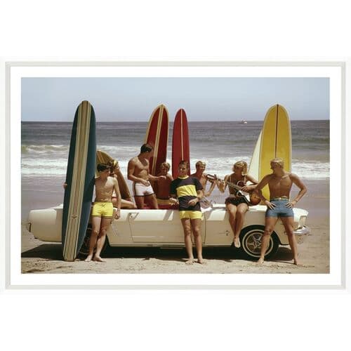 A 1964 photograph by Tom Kelley showcasing a lively group of young individuals on the beach with their surfboards and a Ford Mustang. Printed on premium paper and elegantly framed, it is ready for display.