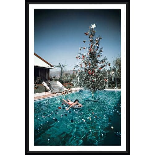 Photographed in Hollywood in 1954, this iconic image by Slim Aarons features his wife, Rita, swimming in a pool decorated for Christmas. The photo, printed on archival paper, is delivered matted, framed, and ready for display.