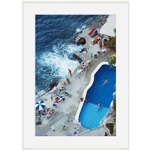 Captured in September 1984 by Slim Aarons, this photo offers an aerial view of a pool on Italy's Amalfi Coast. Printed on archival paper, it comes matted, framed, and ready to hang.