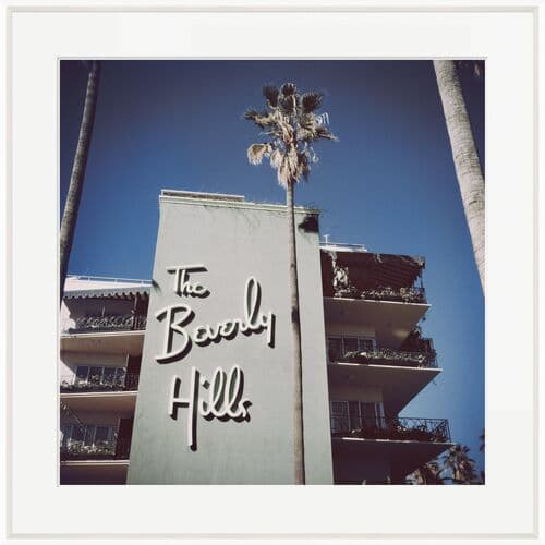 In 1957, photographer Slim Aarons captured the renowned Beverly Hills Hotel on Sunset Boulevard. This photograph is printed on archival paper, then matted and framed, making it ready for display.