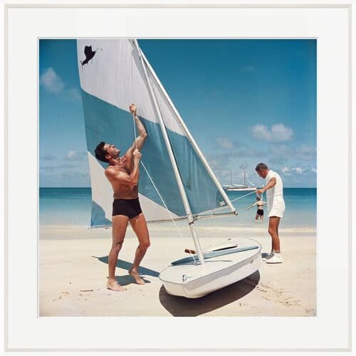 In 1961, Slim Aarons photographed American actor Hugh O'Brian as he raised a sail on an Antigua beach. The image is printed on archival paper and comes matted, framed, and ready for display.