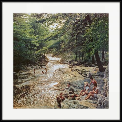 In 1959, Slim Aarons captured a family having a picnic beside the Whiting River near Campbell Falls, MA. The image is printed on archival paper, arriving framed and ready to hang.