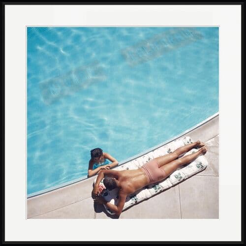 Captured in 1959, Slim Aarons' photograph shows a couple enjoying a poolside day near Lake Tahoe. The pool's line marks the Nevada-California border. Printed on archival paper, the photo comes framed for immediate display.