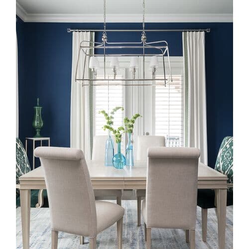 Bringing an air of delicacy to the traditional lantern design, Libby Langdon designs with elegant curves and intricate details. This eight-bulb linear chandelier pairs well with farmhouse-style and classically traditional rooms.