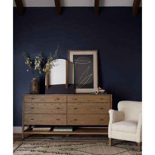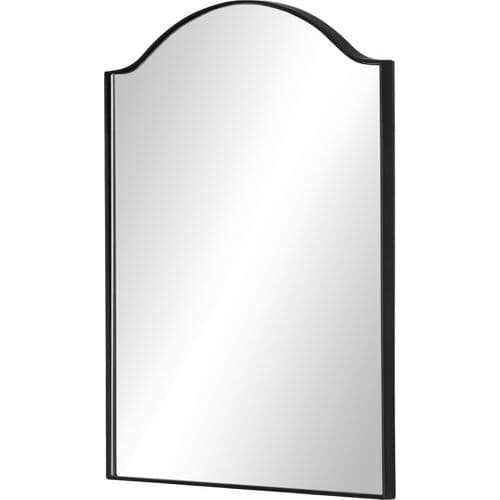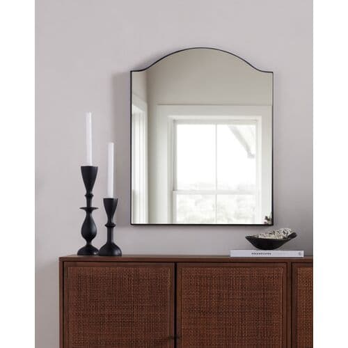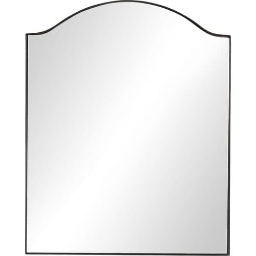 Featuring nearly square dimensions, a curved top, and a slim antiqued brass frame, this wall mirror adds an understated yet striking presence to any room.